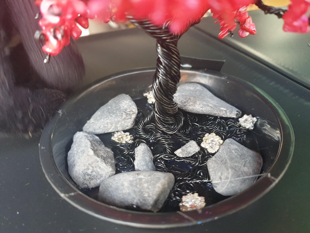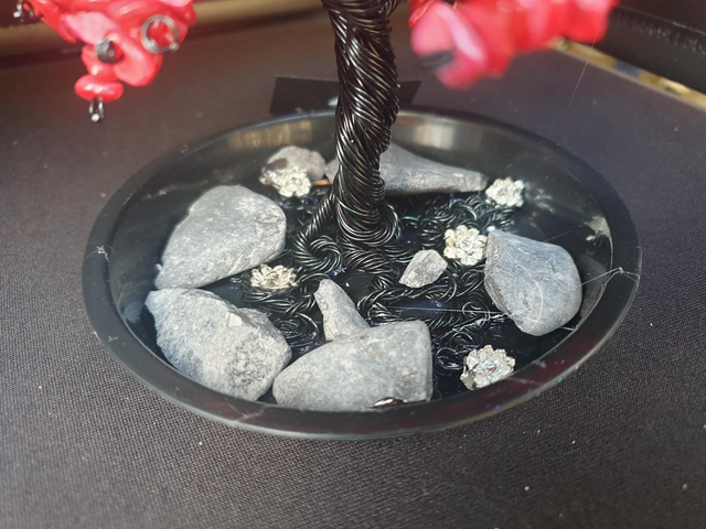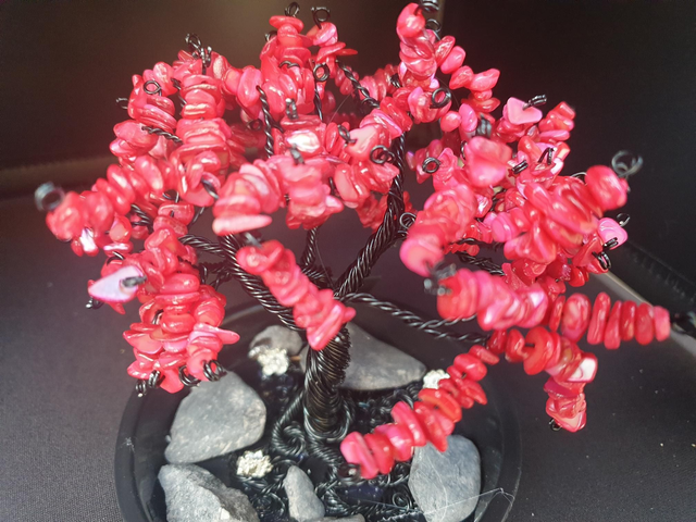 Handmade wire tree made from over 150 individual strands of black anodised aluminium wire and red coral amazonite stone chips, set on a base decorated with granite boulders and lotus flowers.
