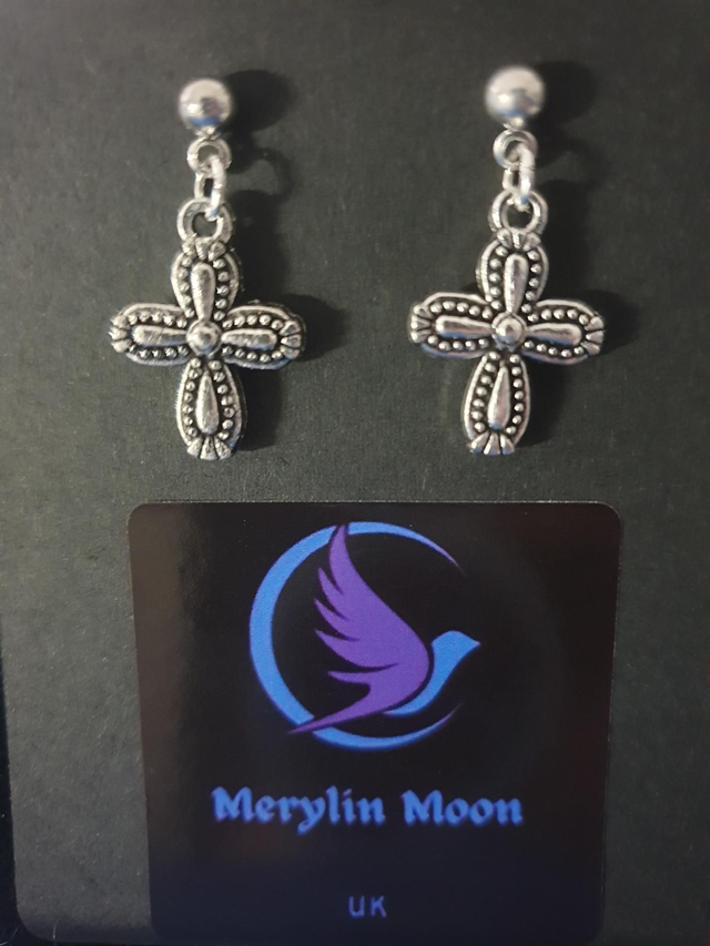 Stylised flower cross captured in tibetan silver on stainless steel posts with butterfly style backs.