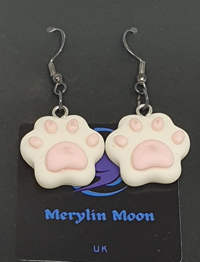 Cute paw prints in white with pink beans on stainless steel hook style backs.