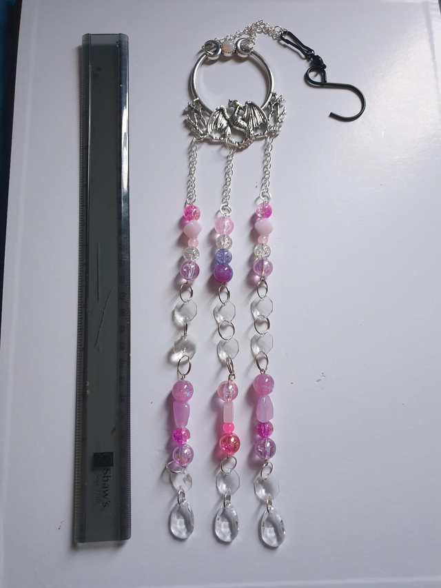 Dragon topped suncatcher with 3 strands pink and purple beads