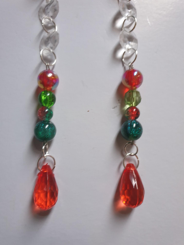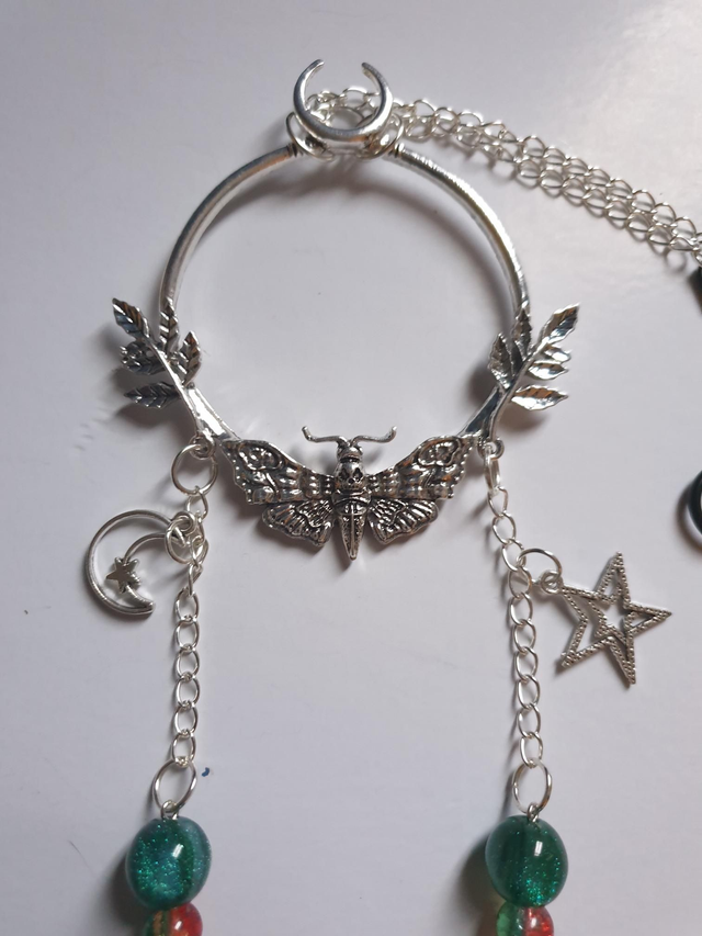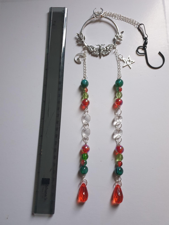 Moth topped suncatcher with 2 strands Christmas coloured beads and moon and star charms.